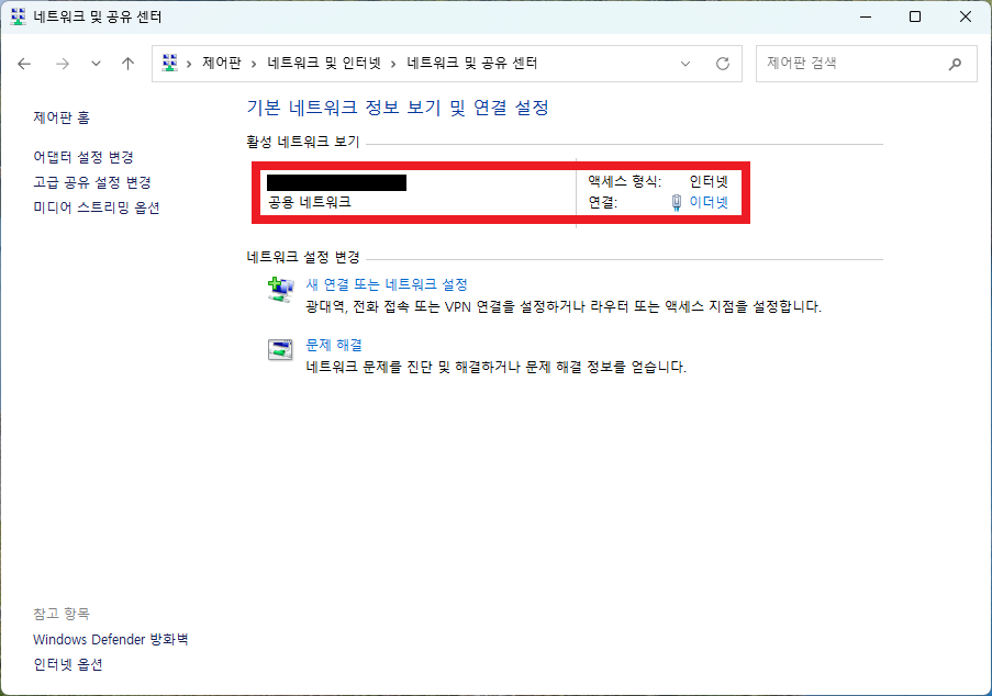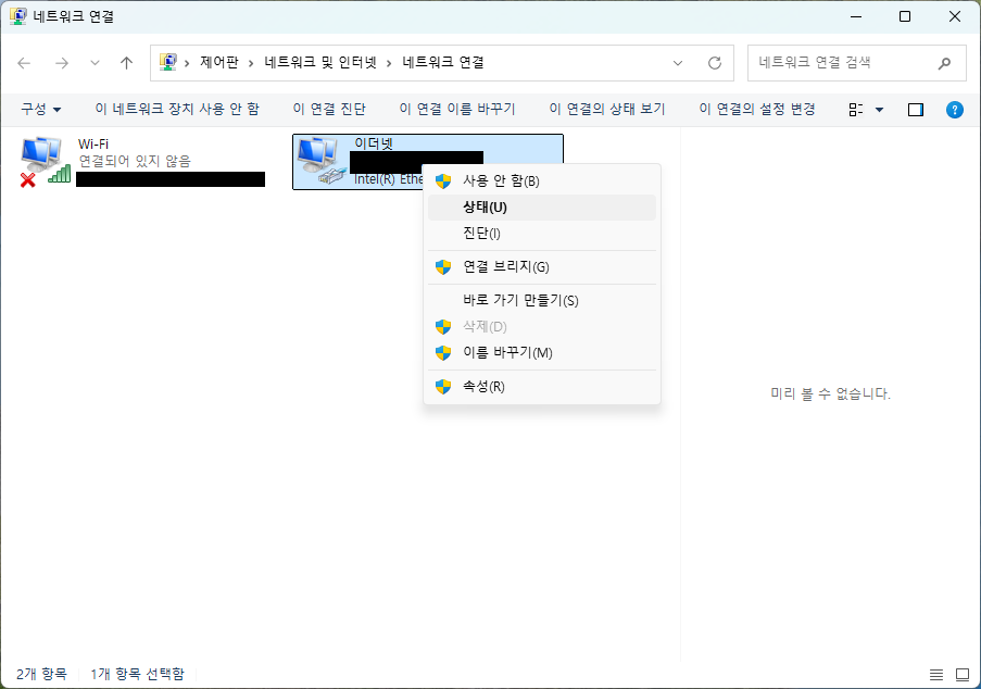 - 제어판 → 네트워크 및 공유 센터 → 어댑터 상태 확인