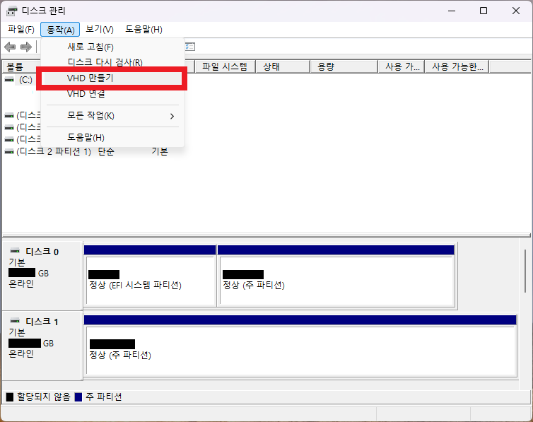 - 가상 디스크 생성: Win + X키를 눌러서 디스크 관리(K)를 선택하고 동작 메뉴에서 VHD 만들기를 통해 금고로 쓸 공간을 확보합니다.