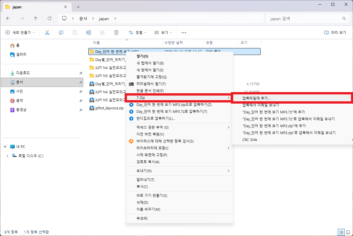 - 중요 문서들이 담긴 폴더를 우클릭하고 7-Zip -> 압축 파일에 추가를 선택합니다.