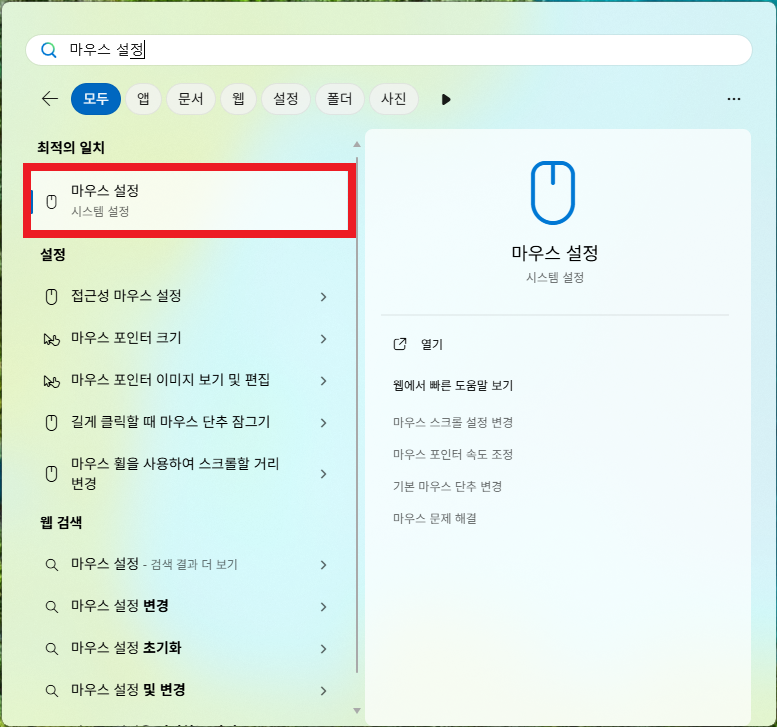 - 또는 시작 검색 → 마우스 설정 → 추가 마우스 옵션