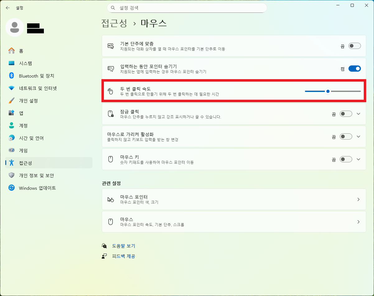 상단 버튼 탭에서 더블클릭 속도를 조절할 수 있습니다.