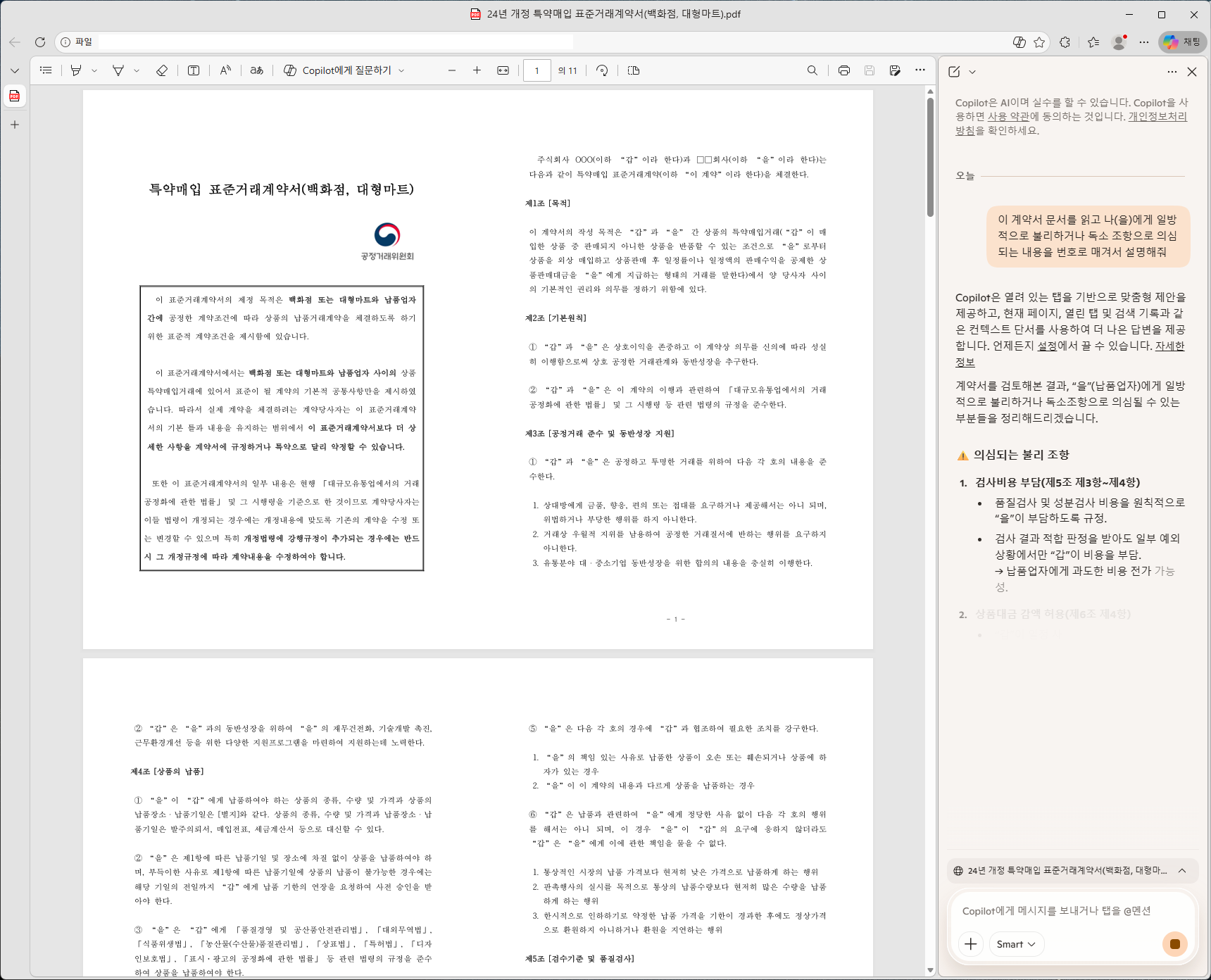 윈도우 코파일럿은 수조 개의 텍스트 데이터를 학습하여 일반적인 계약서의 표준 패턴과 다른, '일방적으로 불리한 조항'을 기가 막히게 찾아냅니다.