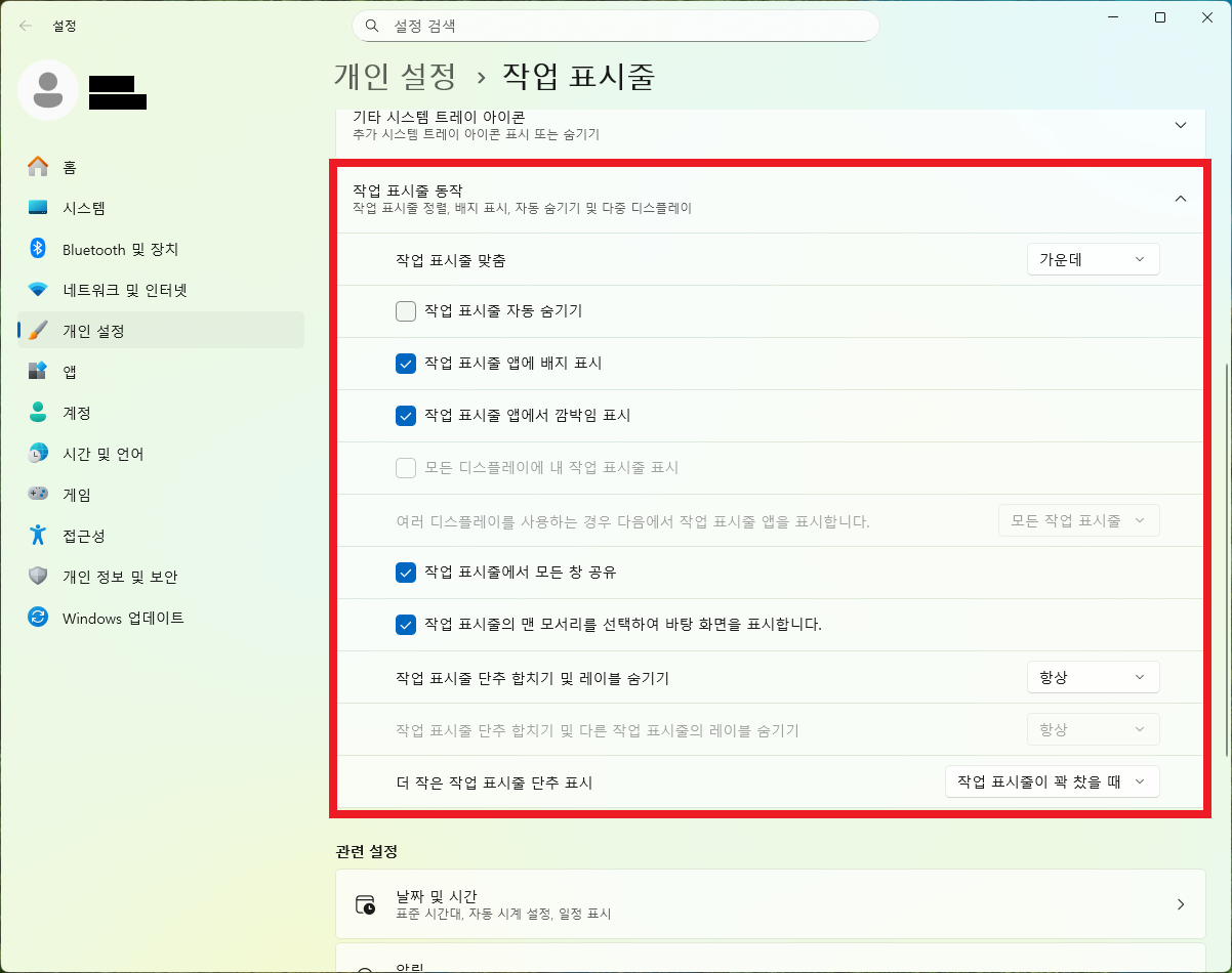 윈도우11에서는 작업표시줄 위치 변경 기능이 기본 설정에서 제공되지 않습니다. 대신 아이콘 정렬(가운데·왼쪽)만 변경할 수 있습니다.