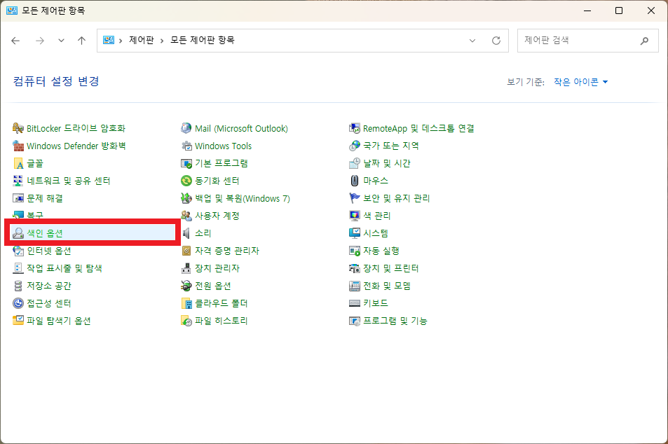 - 제어판 → 색인(인덱싱) 옵션