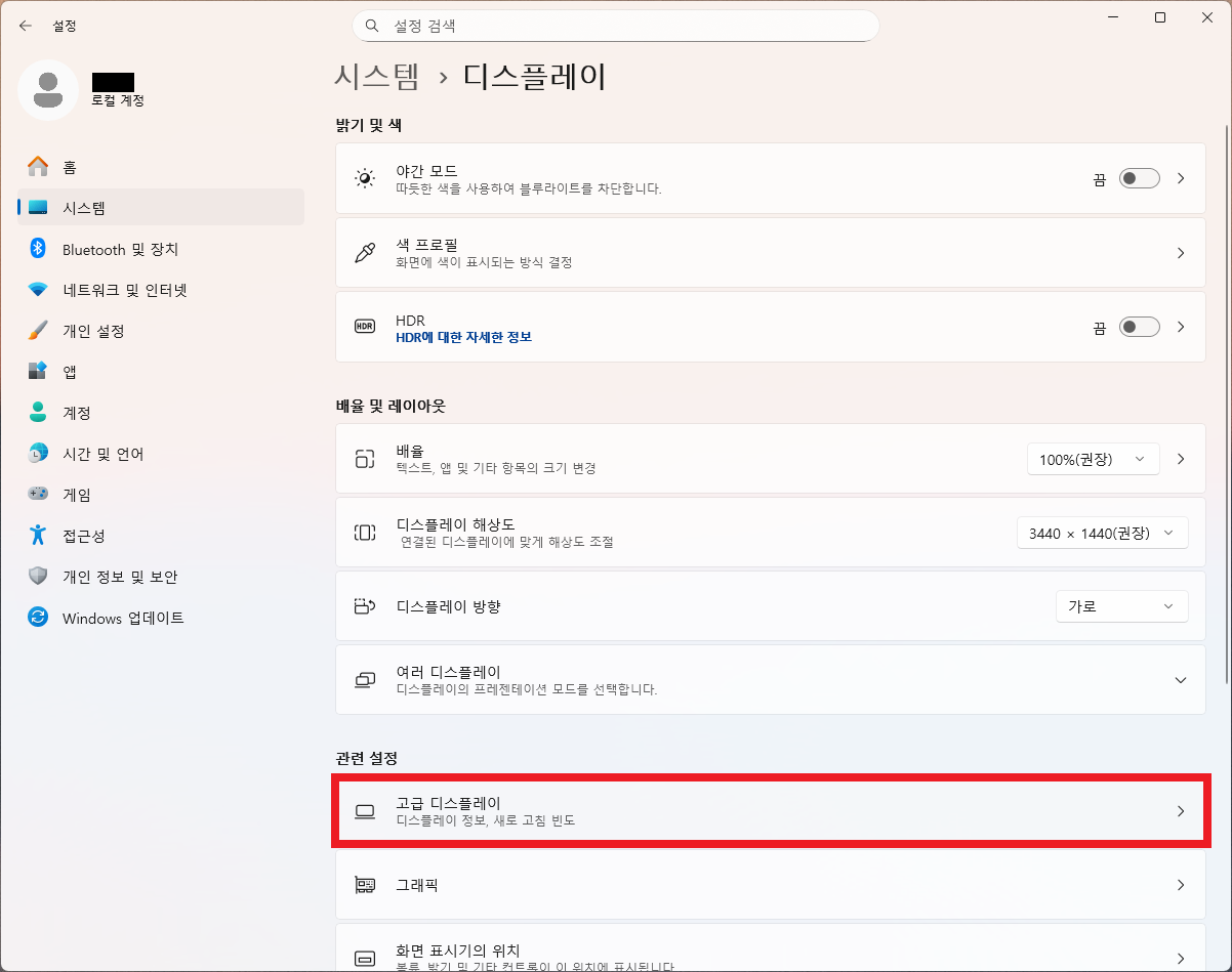 - 아래로 내려 고급 디스플레이 설정 클릭