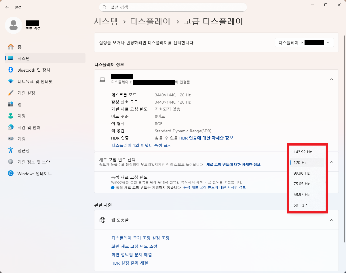 여기에서 144Hz, 120Hz 등이 선택 가능하다면 단순 설정 문제입니다. 원하는 주사율로 변경하면 바로 적용됩니다.