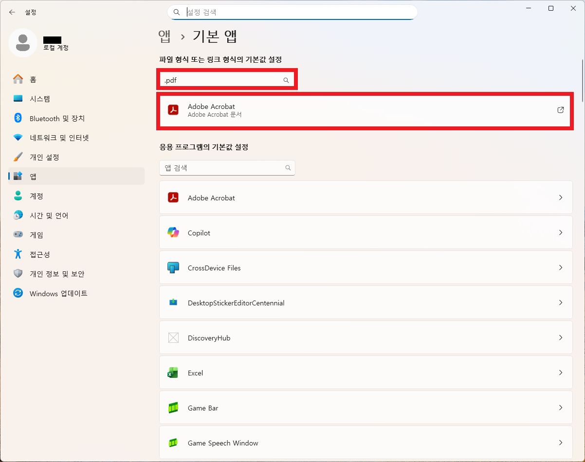 - 설정 → 기본 앱에서 .pdf 연결 확인