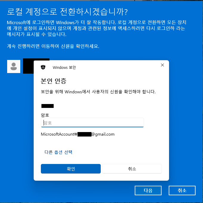 윈도우 키 + I 키를 눌러 설정 창을 엽엽니다. 계정 탭 > 사용자 정보에 들어가서 계정 설정을 확인합니다. Microsoft 계정으로 로그인되어 있다면 로컬 계정으로 로그인해야 합니다. 로컬 계정 전환 절차를 마치고 2번으로 넘어갑니다. 이미 로컬 계정으로 로그인되어 있으신 분들은 바로 2번으로 넘어가시면 됩니다.
