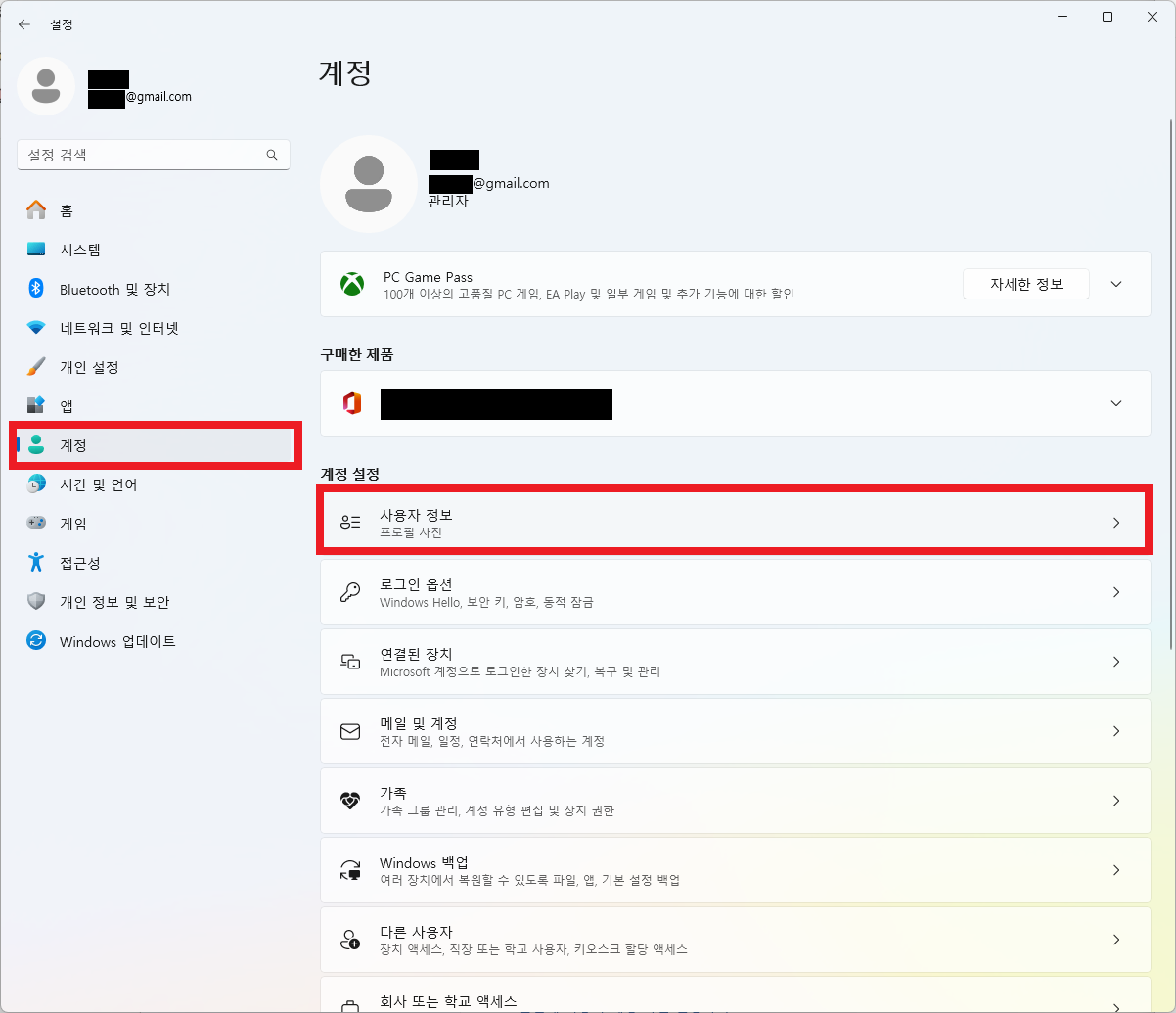 윈도우 키 + I 키를 눌러 설정 창을 엽엽니다. 계정 탭 > 사용자 정보에 들어가서 계정 설정을 확인합니다. Microsoft 계정으로 로그인되어 있다면 로컬 계정으로 로그인해야 합니다. 로컬 계정 전환 절차를 마치고 2번으로 넘어갑니다. 이미 로컬 계정으로 로그인되어 있으신 분들은 바로 2번으로 넘어가시면 됩니다.