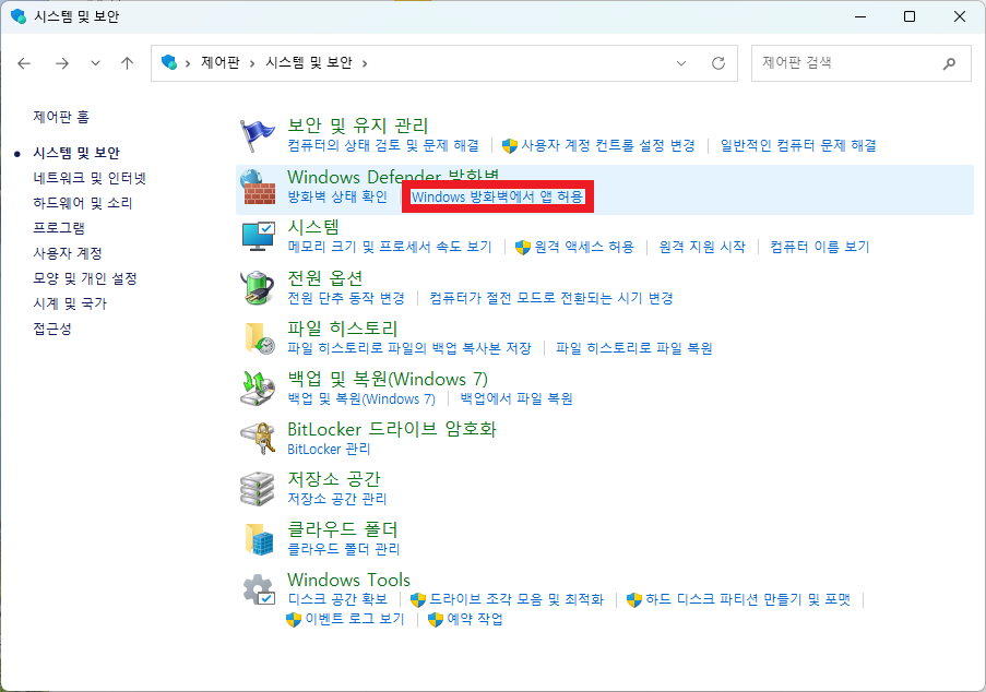 - 제어판 → Windows Defender 방화벽