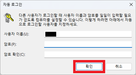 사용자 이름과 암호를 입력해야 이 컴퓨터를 사용할 수 있음(E)의 체크박스를 해제하고 적용을 누릅니다. 자동 로그인 창이 뜨면 암호 칸에 로그인 암호를 입력하고 확인을 누릅니다. 없다면 입력하지 않고 바로 확인을 누릅니다.