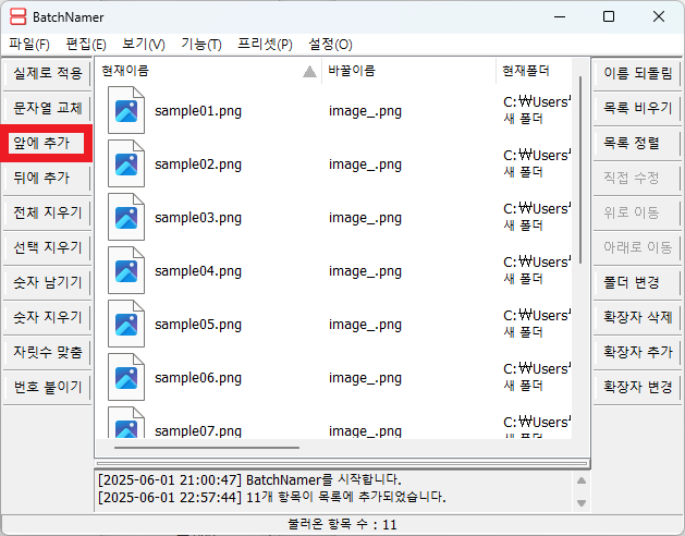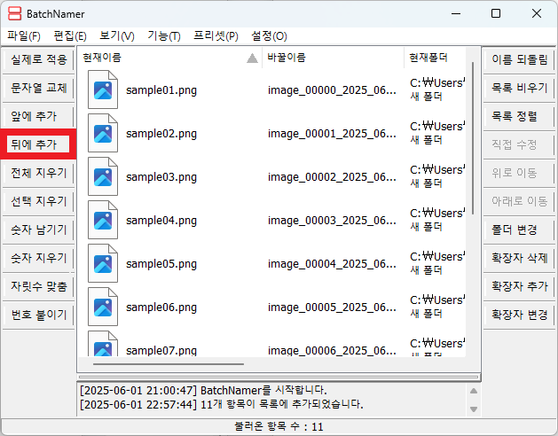 - 가운데: 불러온 파일 목록 및 변경 후 파일명 미리보기