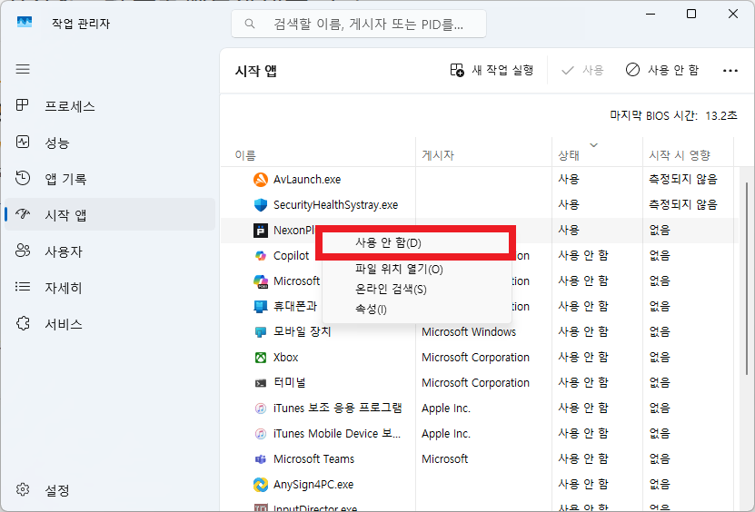 컴퓨터가 시작될 때 자동으로 실행하지 않을 앱을 선택하여 우클릭한 뒤, 사용 안 함(D)를 클릭합니다.