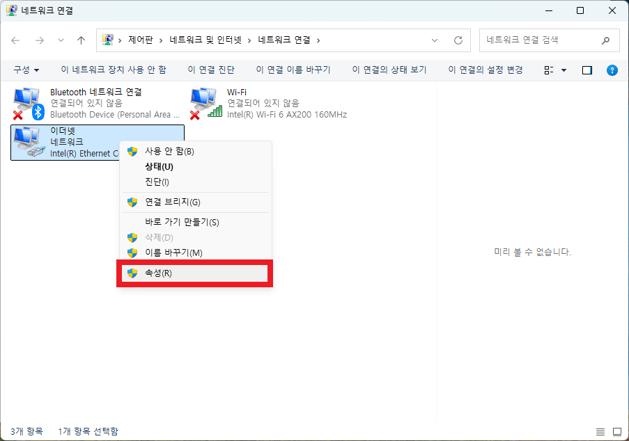 - 사용 중인 네트워크 어댑터 우클릭 → 속성