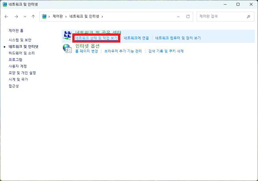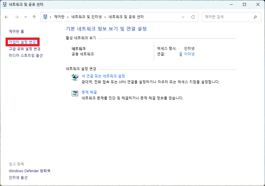 - 제어판 → 네트워크 및 공유 센터 → 어댑터 설정 변경