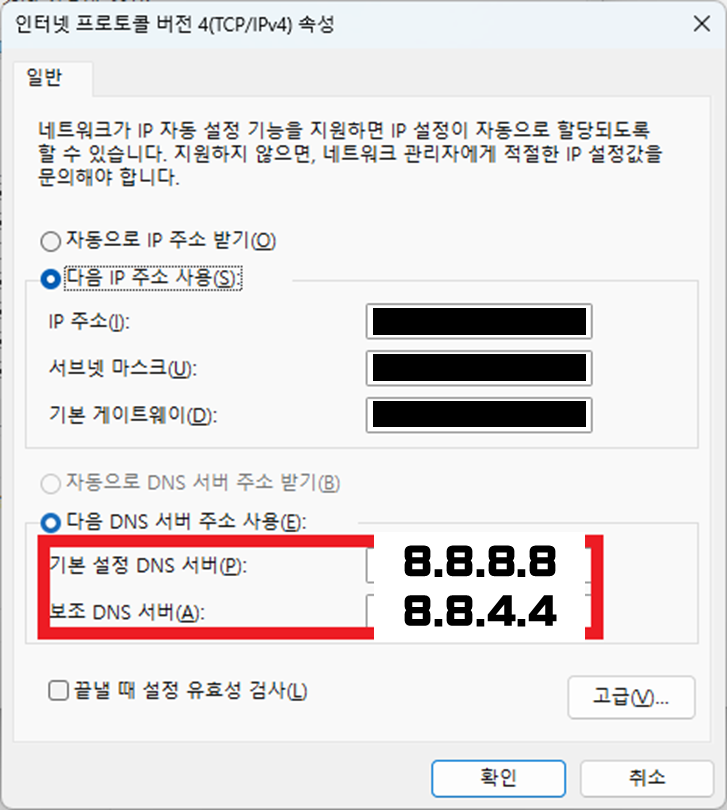 기본 DNS는 느릴 수 있기 때문에, 구글 DNS(8.8.8.8 / 8.8.4.4)나 클라우드플레어 DNS(1.1.1.1)를 설정하면 속도가 개선되는 경우가 많습니다.