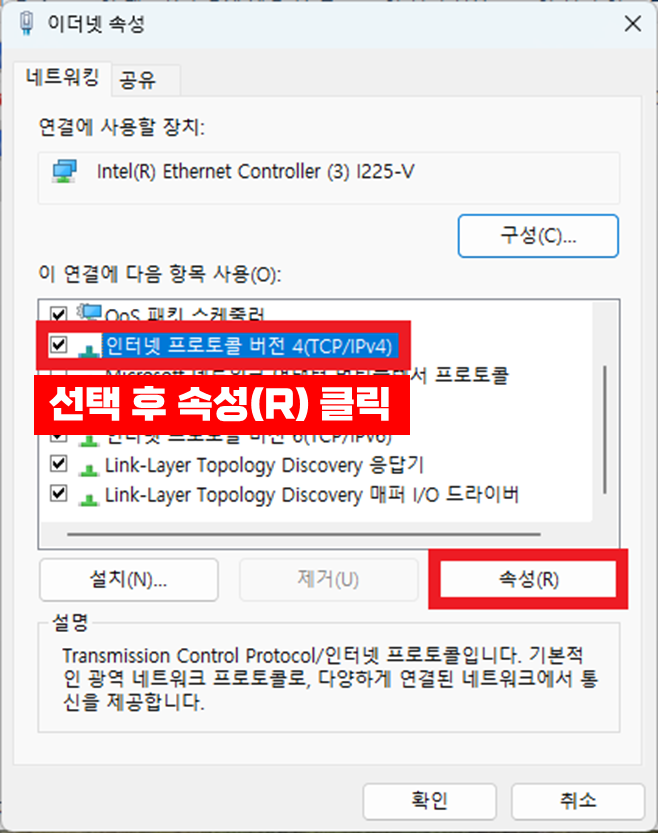 - 인터넷 프로토콜 버전 4 (TCP/IPv4) 선택 → 속성