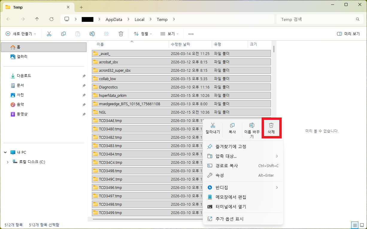 - %temp% 폴더는 사용 중 파일 제외하고 삭제 가능