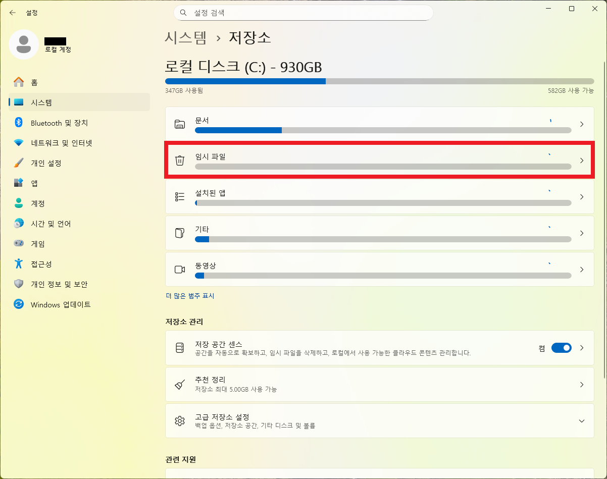 - 설정 → 저장소 → 임시 파일이 가장 안전