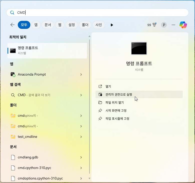 윈도우 키를 누르고 검색에서 CMD 입력 후 관리자 권한으로 실행합니다.