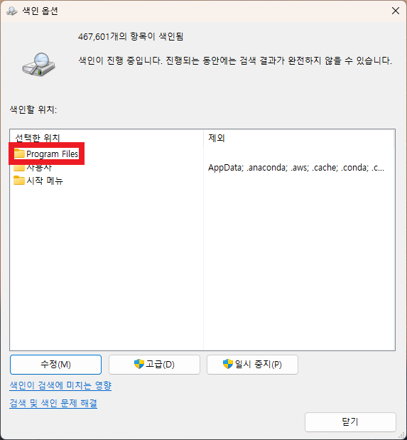 - 제어판 → 색인(인덱싱) 옵션