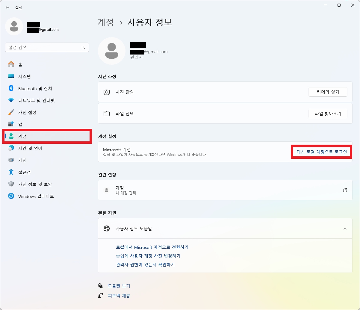 윈도우 키 + I 키를 눌러 설정 창을 엽엽니다. 계정 탭 > 사용자 정보에 들어가서 계정 설정을 확인합니다. Microsoft 계정으로 로그인되어 있다면 로컬 계정으로 로그인해야 합니다. 로컬 계정 전환 절차를 마치고 2번으로 넘어갑니다. 이미 로컬 계정으로 로그인되어 있으신 분들은 바로 2번으로 넘어가시면 됩니다.